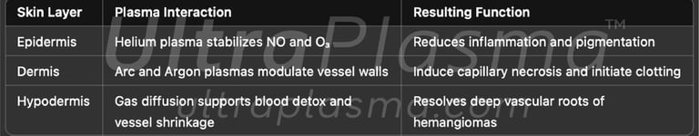 Hemangiomas—benign vascular tumors characterized by an abnormal proliferation of blood vessels—pose both aesthetic and medical challenges. Traditionally managed with laser therapy, corticosteroids, or surgical intervention, modern dermatology now embraces plasma medicine as a revolutionary alternative. UltraPlasma™ introduces a next-generation, multi-platform plasma system that integrates arc plasma, argon plasma, and helium plasma, controlled via proprietary software-hardware output spectrum modulation. This system targets the epidermal, dermal, and hypodermal vasculature, improving outcomes through precision oxidation and gas-mediated modulation.